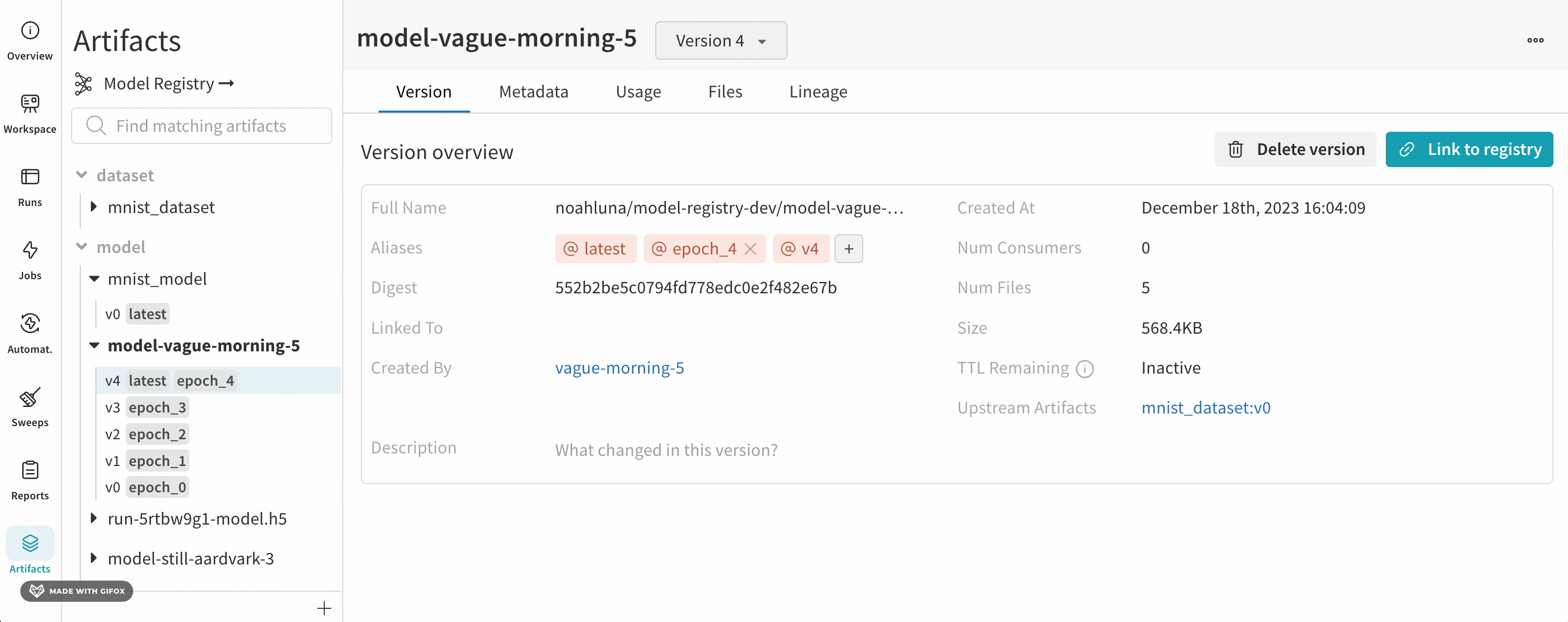 For example, the following image shows a v0 model version called mnist_model (see Source version field mnist_model:v0), linked to a registered model called MNIST-dev.