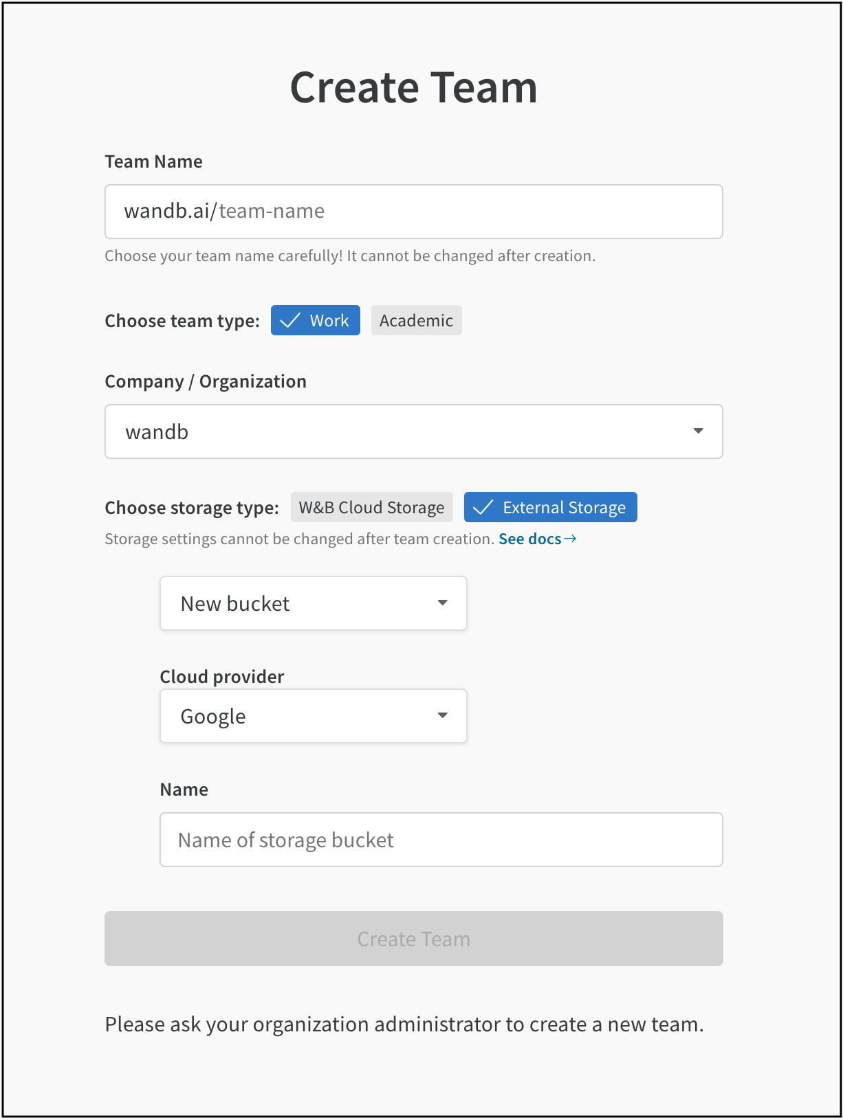 Multiple W&B Teams can use the same cloud storage bucket. To enable this, select an existing cloud storage bucket from the dropdown.