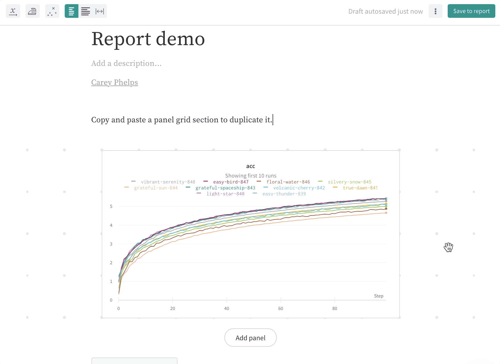 Reports consist of blocks. Blocks make up the body of a report. Within these blocks you can add text, images, embedded visualizations, plots from experiments and run, and panels grids.