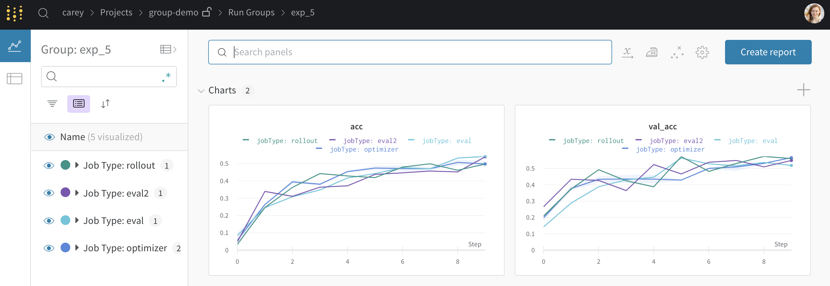 オプションのgroupとjob_typeをwandb.init()に渡します。これにより、個々のrunを含む各実験専用のグループページが作成されます。例えば: wandb.init(group="experiment_1", job_type="eval")