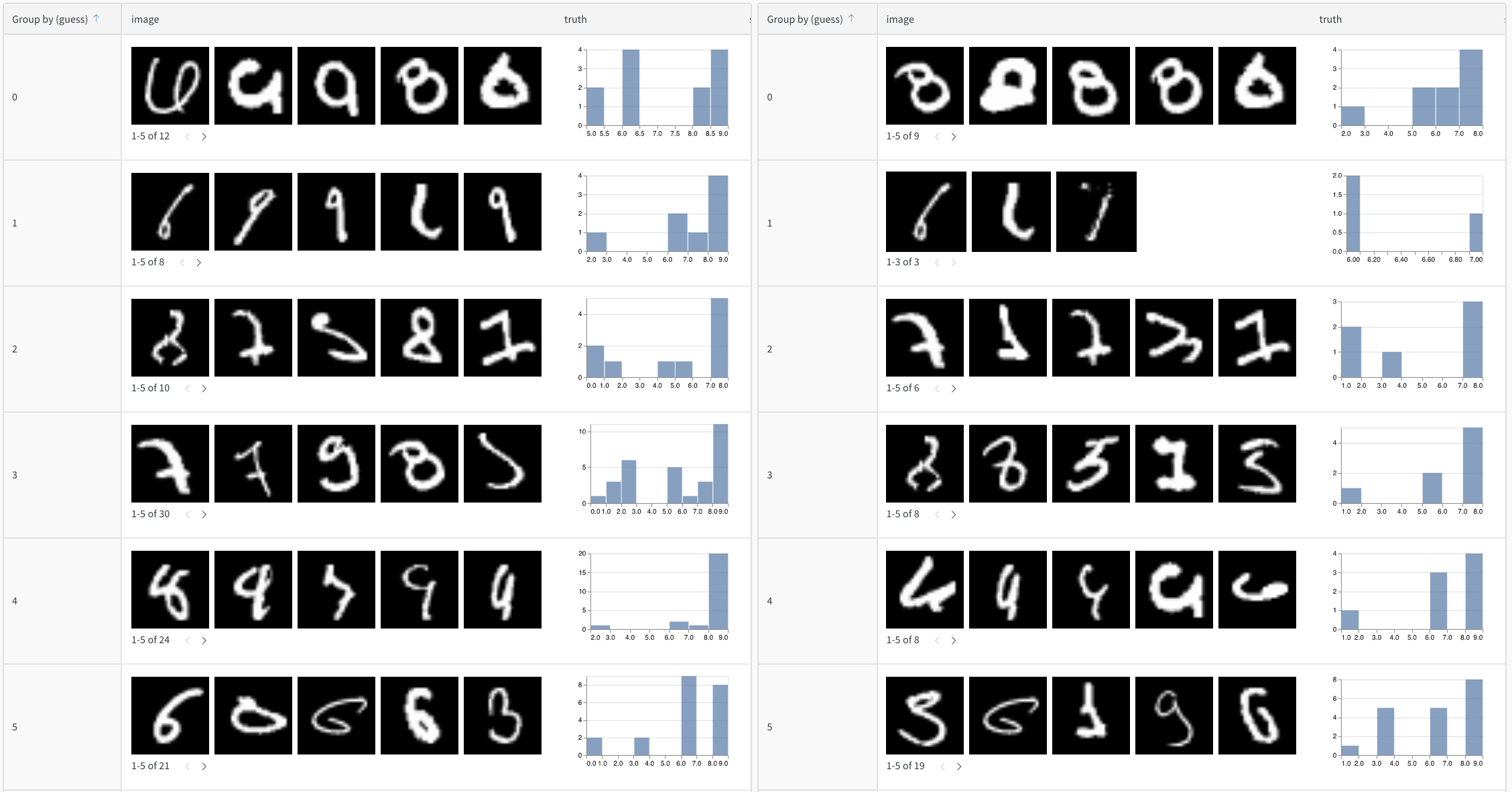 結合ビュー または 並列ビューを使用して2つのテーブルを比較します。以下の画像は、MNISTデータのテーブル比較を示しています。
