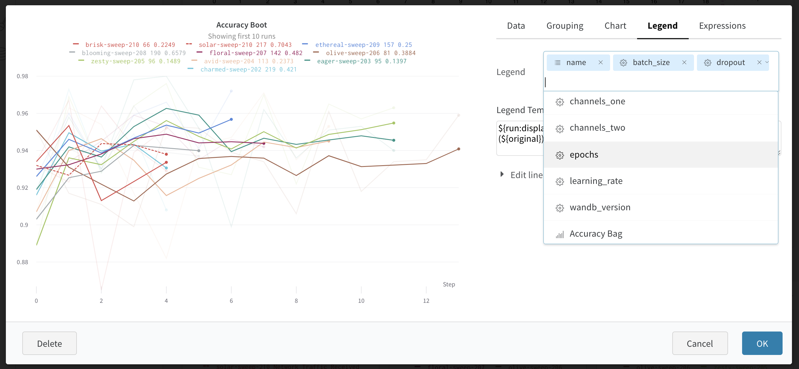 • 범례: 플롯의 범례에 표시하고 싶은 필드를 선택합니다. 예를 들어, run의 이름과 학습률을 표시할 수 있습니다.